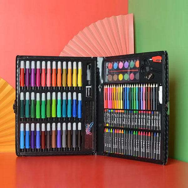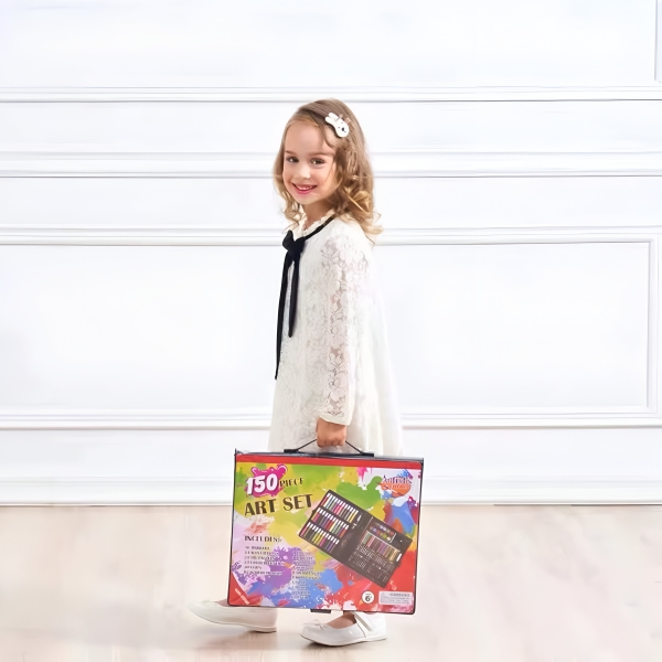V tem popolnem kompletu je ne glede na to, ali ste v šoli ali doma, na voljo 150 likovnih pripomočkov, vključno z barvicami, svinčniki, akvarelnimi peresi in škarjami. Idealen za otroke, ki začenjajo svojo umetniško pot.
