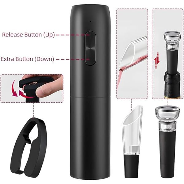 S tem kompletom električnih odpiračev za vino z zmogljivo napravo, ki gladko odstranjuje zamaške s steklenic, lahko brez težav odpirate vino. Poslovite se od težav s tradicionalnimi zamaški in tveganja zlomljenih zamaškov. Vsakič uživajte v doslednem in brezskrbnem odpiranju vina.