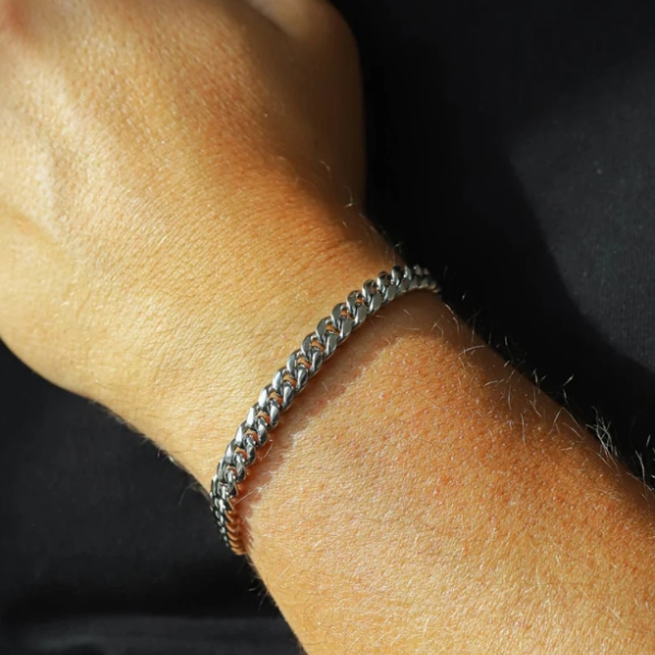 Predstavljamo zapestnico iz nerjavečega jekla CUFFLINK, mojstrsko izdelan dodatek, ki pooseblja združitev sodobnega sloga in trajne moškosti.
