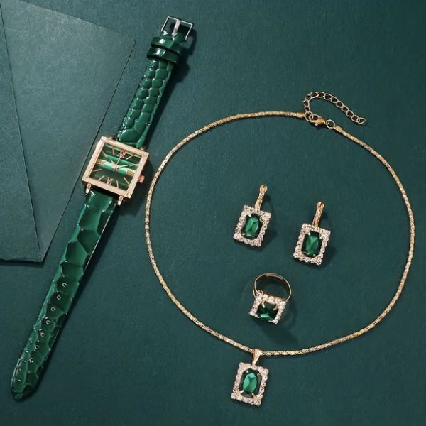 Ta elegantna kombinacija vsebuje starinsko kvarčno uro s kvadratnimi kazalci v osupljivih zelenih odtenkih, ki jih dopolnjuje osupljiv komplet nakita s kristali, s katerim lahko izboljšate svoj slog in delite eleganco s svojimi najdražjimi. 🎁⌚💚